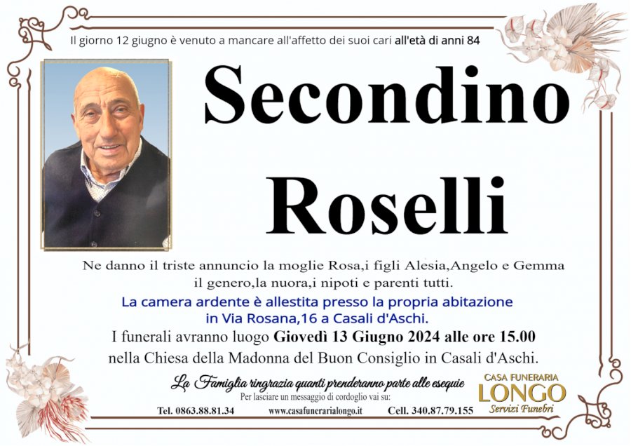 Il giorno 12 giugno è venuto a mancare all'affetto dei suoi cari all'età di anni 84nSecondino RosellinNe danno il triste annuncio la moglie Rosa,i figli Alesia,Angelo e Gemma il genero,la nuora,i nipoti e parenti tutti.nLa camera ardente è allestita presso la propria abitazione in Via Rosana,16 a Casali d'Aschi.nI funerali avranno luogo Giovedì 13 Giugno 2024 alle ore 15.00 nella Chiesa della Madonna del Buon Consiglio in Casali d'Aschi.nLa Famiglia ringrazia quanti prenderanno parte alle esequenPer lasciare un messaggio di cordoglio vai su:nTel. 0863.88.81.34 www.casafunerarialongo.it Cell. 340.87.79.155nCASA FUNERARIA LONGO Servizi Funebri