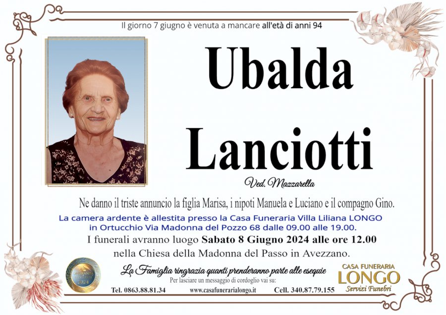 Ne danno il triste annuncio la figlia Marisa, i nipoti Manuela e Luciano e il compagno Gino. La camera ardente è allestita presso la Casa Funeraria Villa Liliana LONGO in Ortucchio Via Madonna del Pozzo 68 dalle 09.00 alle 19.00. I funerali avranno luogo Sabato 8 Giugno 2024 alle ore 12.00 nella Chiesa della Madonna del Passo in Avezzano. La Famiglia ringrazia quanti prenderanno parte alle esequie