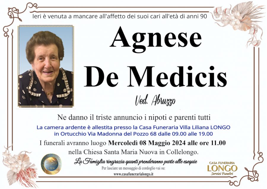 Ieri è venuta a mancare all'affetto dei suoi cari all'età di anni 90 Agnese De Medicis Ved. Abruzzo. Ne danno il triste annuncio i nipoti e parenti tutti. La camera ardente è allestita presso la Casa Funeraria Villa Liliana LONGO in Ortucchio Via Madonna del Pozzo 68 dalle 09.00 alle 19.00. I funerali avranno luogo Mercoledì 08 Maggio 2024 alle ore 11.00 nella Chiesa Santa Maria Nuova in Collelongo. La Famiglia ringrazia quanti prenderanno parte alle esequie. Per lasciare un messaggio di cordoglio vai su: www.casafunerarialongo.it CASA FUNERARIA LONGO Servizi Funebri