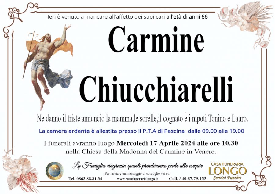 Ieri è venuto a mancare all'affetto dei suoi cari all'età di anni 66 CarminenChiucchiarellinnNe danno il triste annuncio la mamma, le sorelle, il cognato e i nipoti Tonino e Lauro. La camera ardente è allestita presso il P.T.A di Pescina dalle 09.00 alle 19.00 I funerali avranno luogo Mercoledì 17 Aprile 2024 alle ore 10.30 ella Chiesa della Madonna del Carmine in Venere. Le Famiglie ringraziano quanti prenderanno parte alle esequiennPer lasciare un messaggio di cordoglio vai su:nTel. 0863.88.81.34 www.casafunerarialongo.it Cell. 340.87.79.155 CASA FUNERARIAnLONGOnServizi Funebri