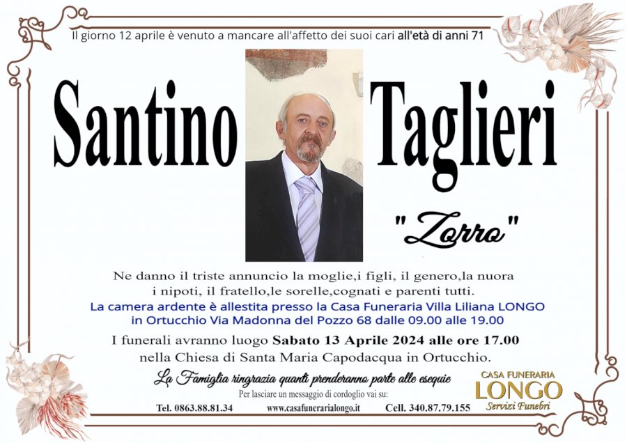 Il giorno 12 aprile è venuto a mancare all'affetto dei suoi cari all'età di anni 71 Santino Taglierin"Zorro" Ne danno il triste annuncio la moglie,i figli, il genero,la nuorani nipoti, il fratello,le sorelle,cognati e parenti tutti. La camera ardente è allestita presso la Casa Funeraria Villa Liliana LONGOnin Ortucchio Via Madonna del Pozzo 68 dalle 09.00 alle 19.00 I funerali avranno luogo Sabato 13 Aprile 2024 alle ore 17.00 ella Chiesa di Santa Maria Capodacqua in Ortucchio. La Famiglia ringrazia quanti prenderanno parte alle esequiennPer lasciare un messaggio di cordoglio vai su:nTel. 0863.88.81.34 www.casafunerarialongo.it Cell. 340.87.79.155 CASA FUNERARIAnLONGOnServizi Funebri