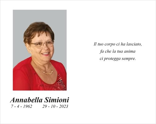 Ne danno il doloroso annuncio: il Marito GERARDO, la Figlia LAURA, gli amati Nipoti GABRIELE e SAMUELE, il Genero GIANLUCA, la Sorella DANIELA, il Cognato NINO, i Nipoti VALENTINA e FABIO, le Cognate, i Cognati, le Zie, gli Zii, Amici e Parenti tutti.